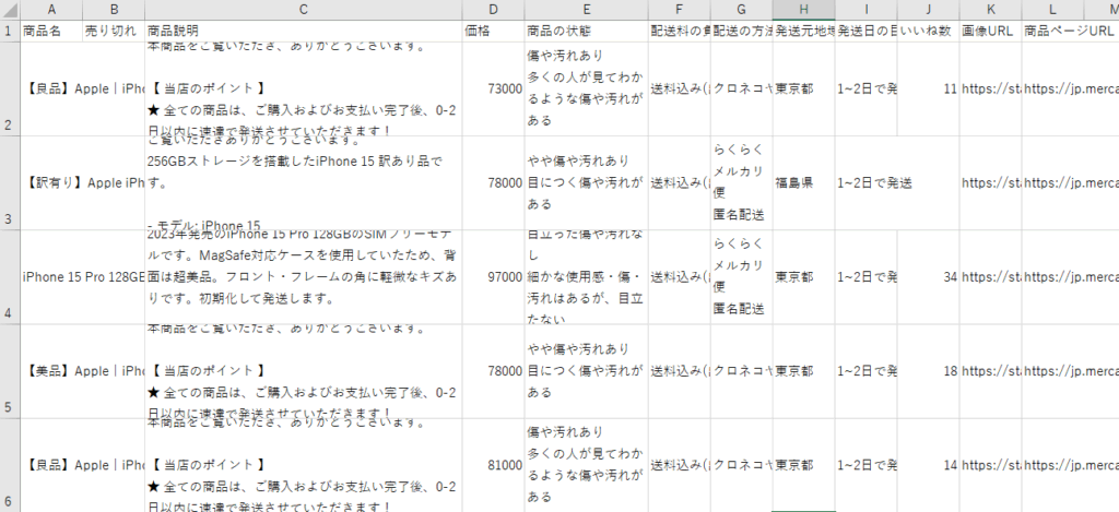 メルカリの商品情報を収集してCSVファイルに出力します。